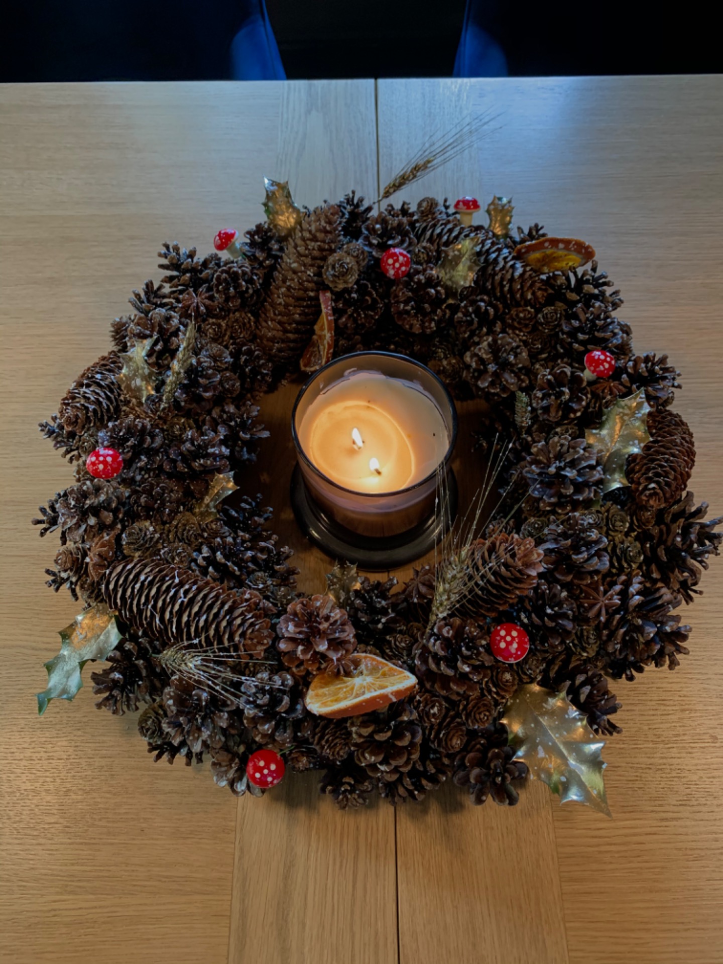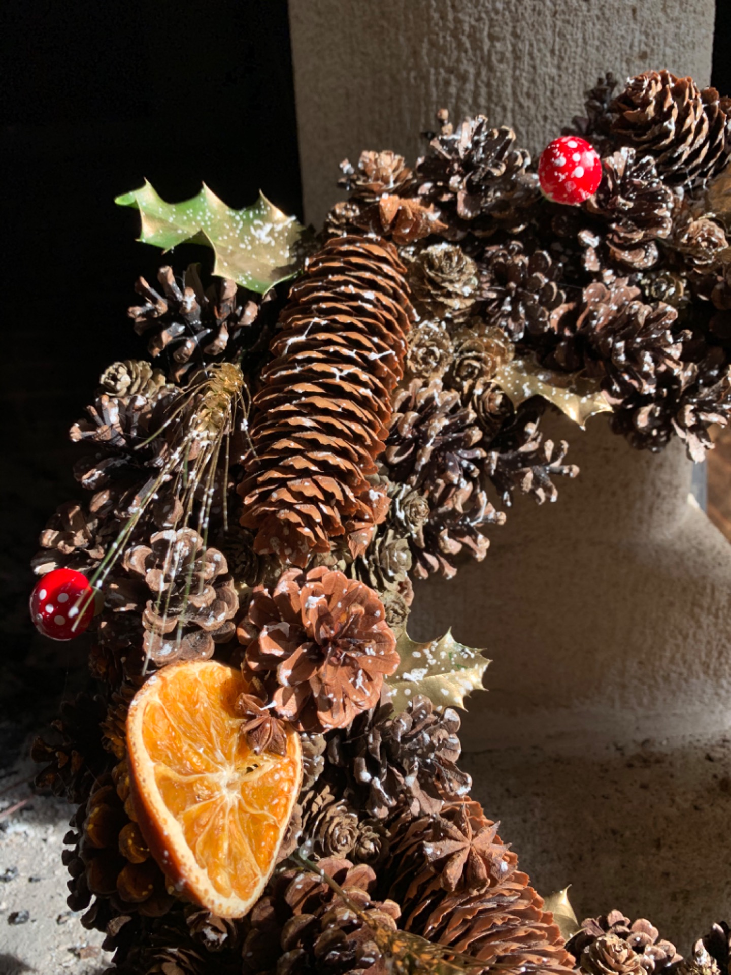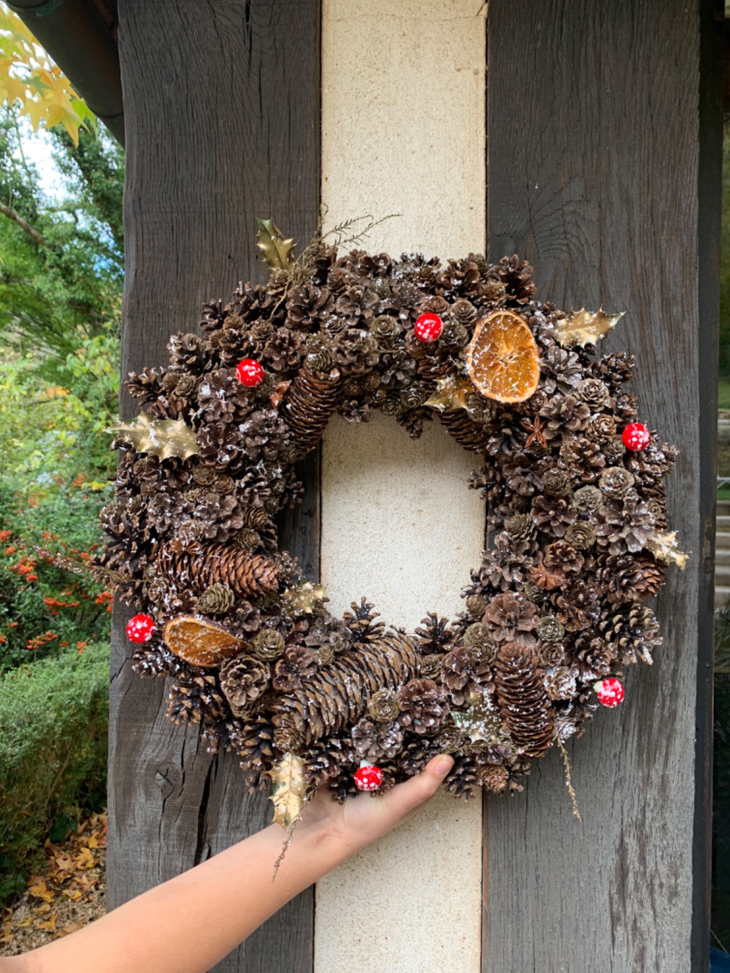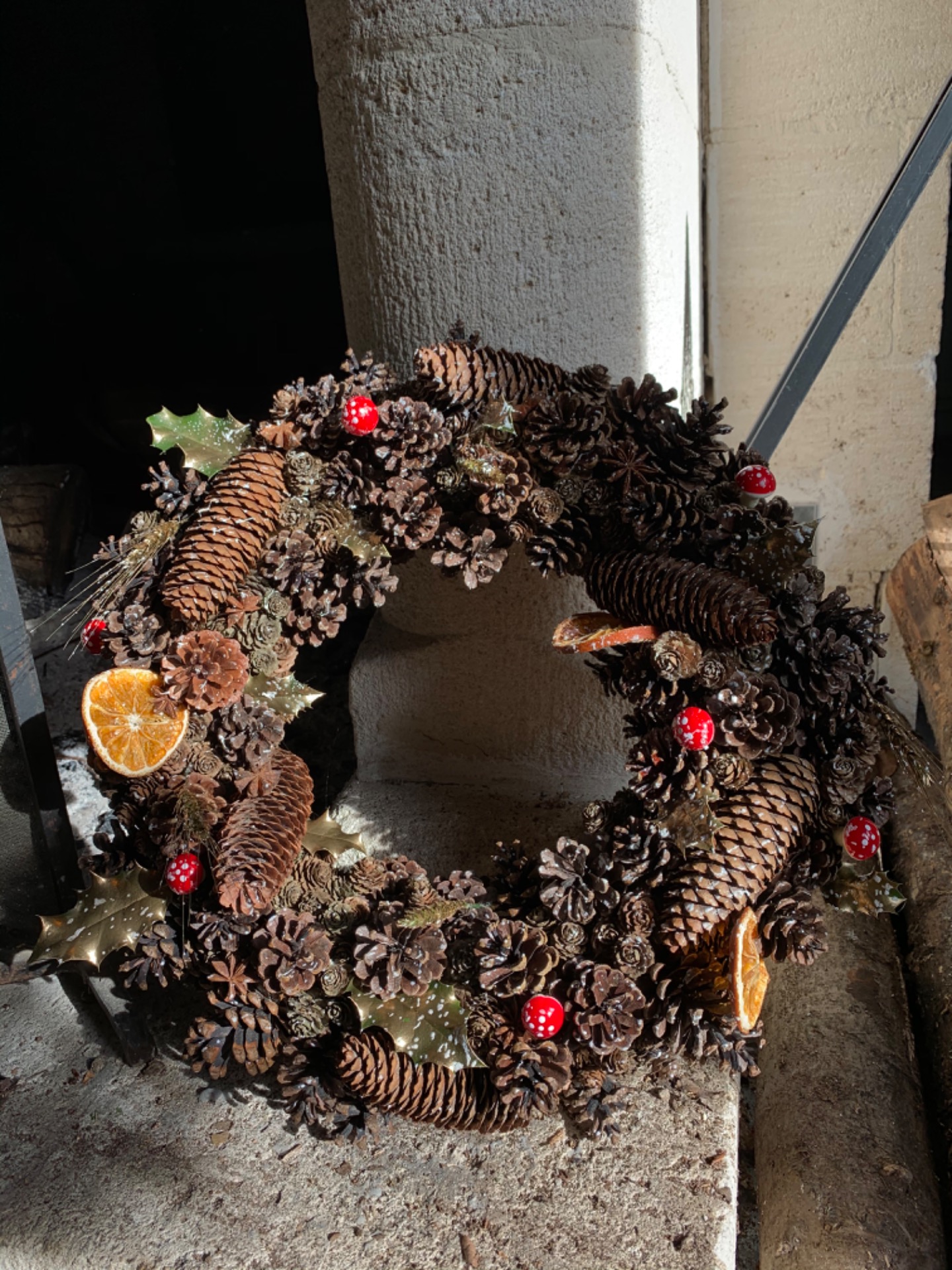 Couronne de pommes de pins (45cm environ de diamètre), avec du houx, des oranges séchées, des petits champignons rouge.