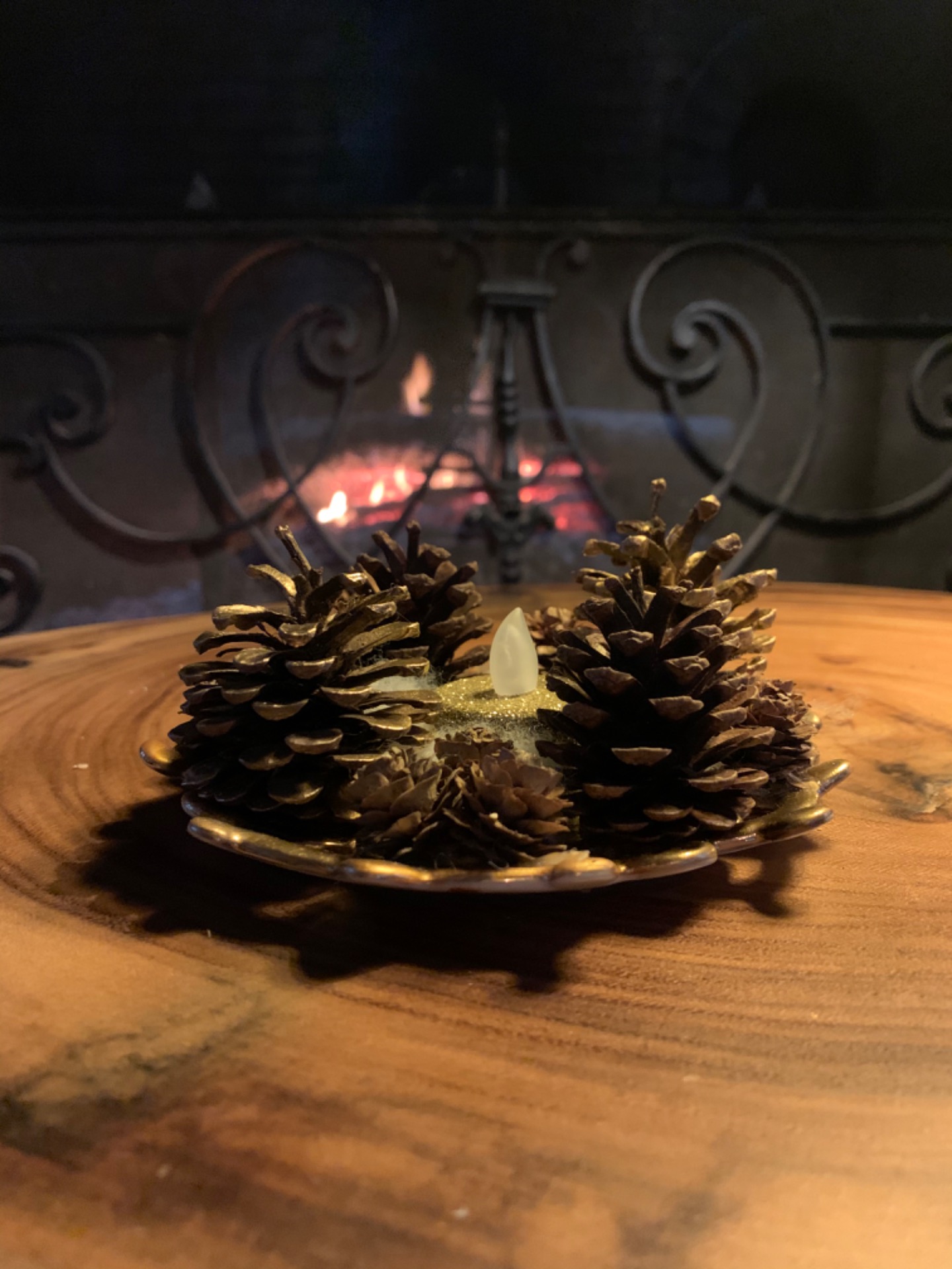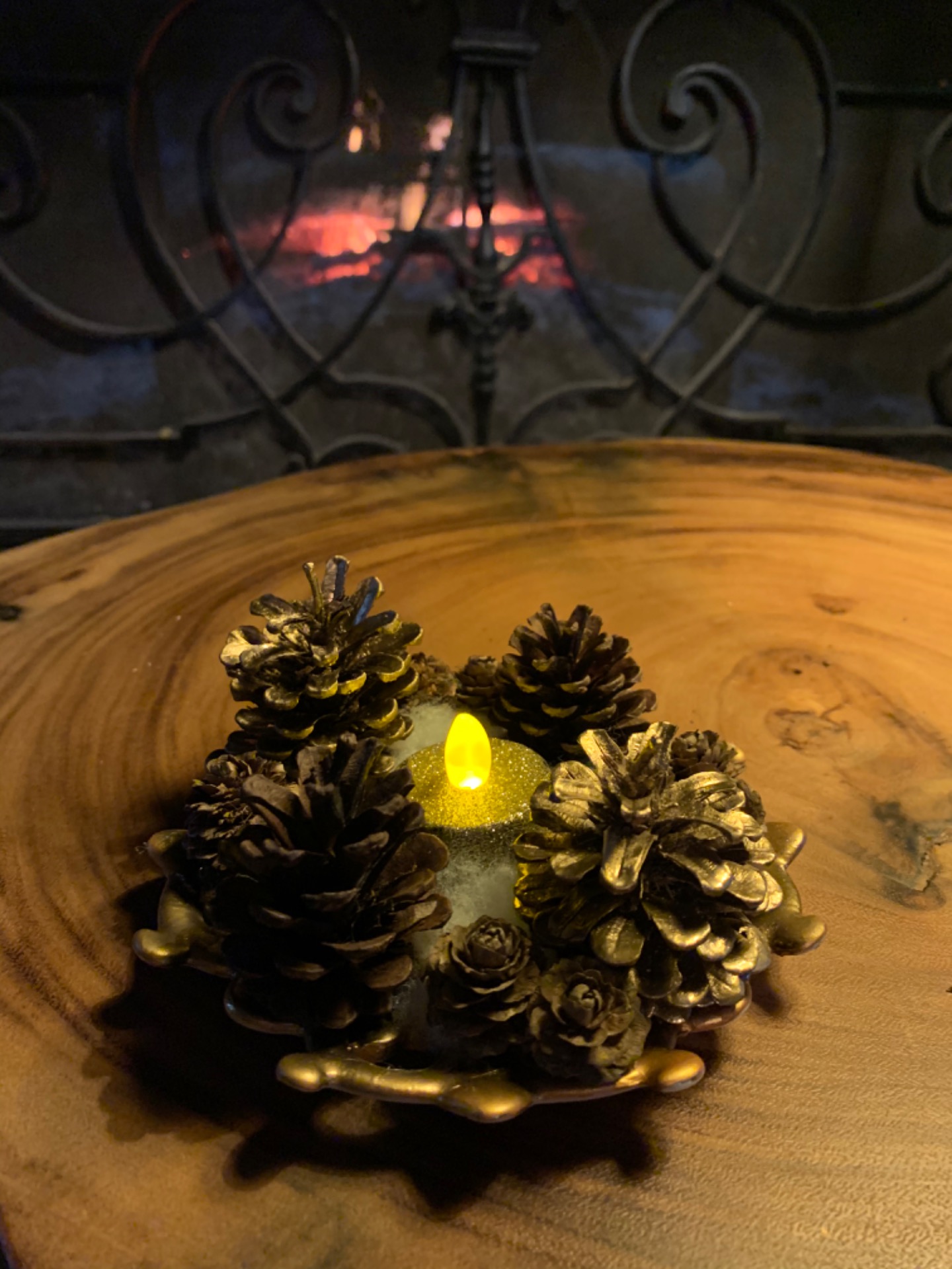 Dessous de tasse décoré avec des pommes de pins, du houx et une bougie à pile or.