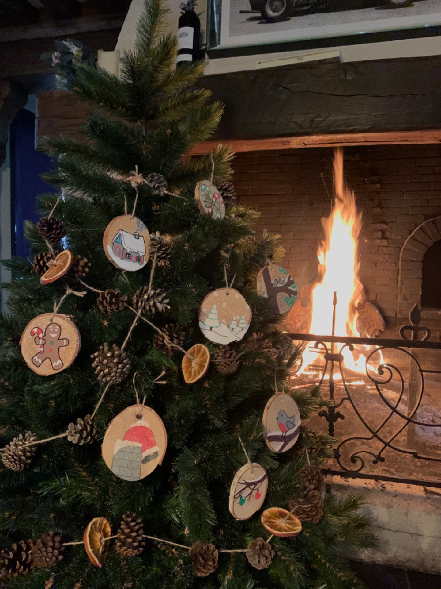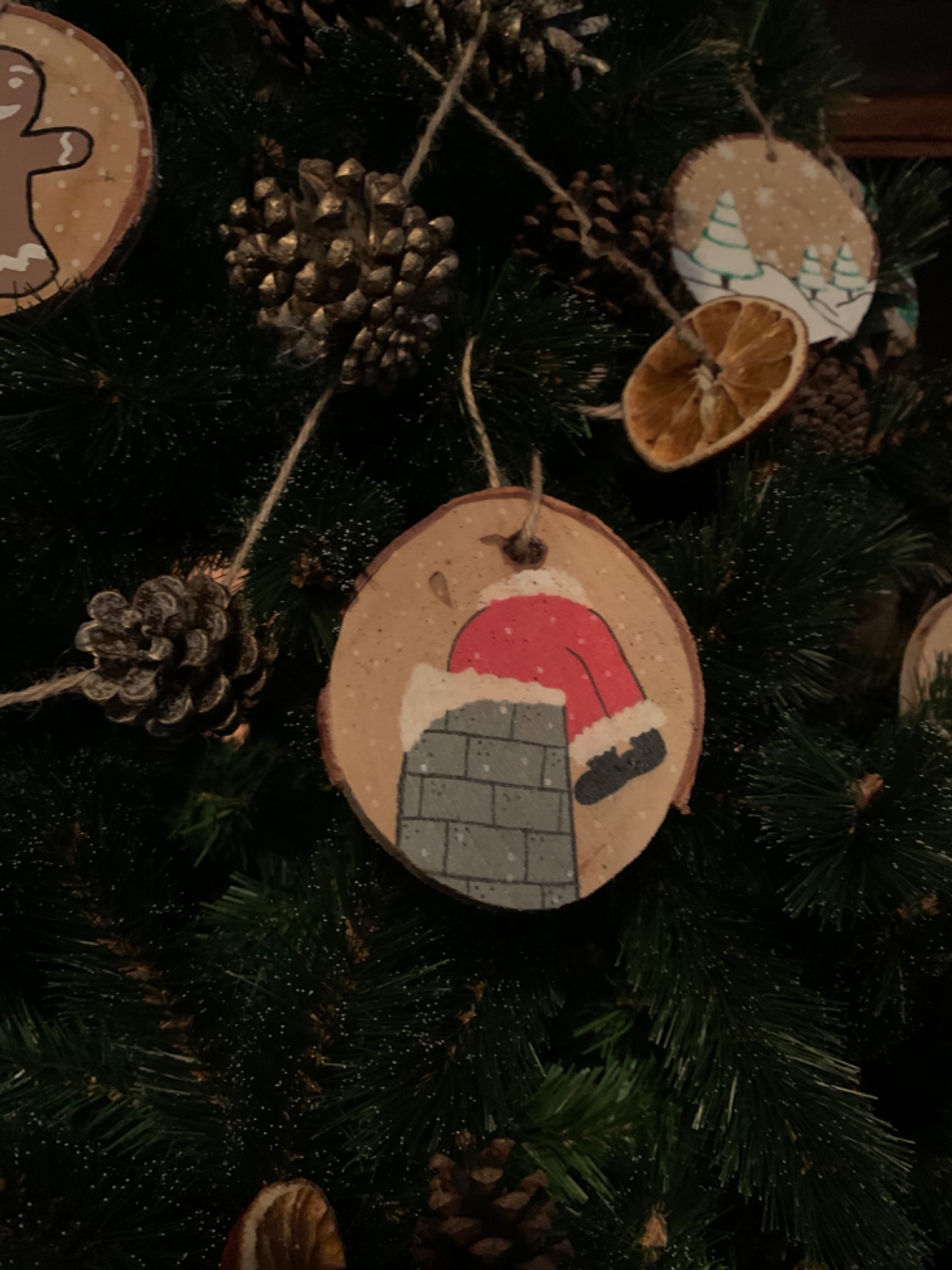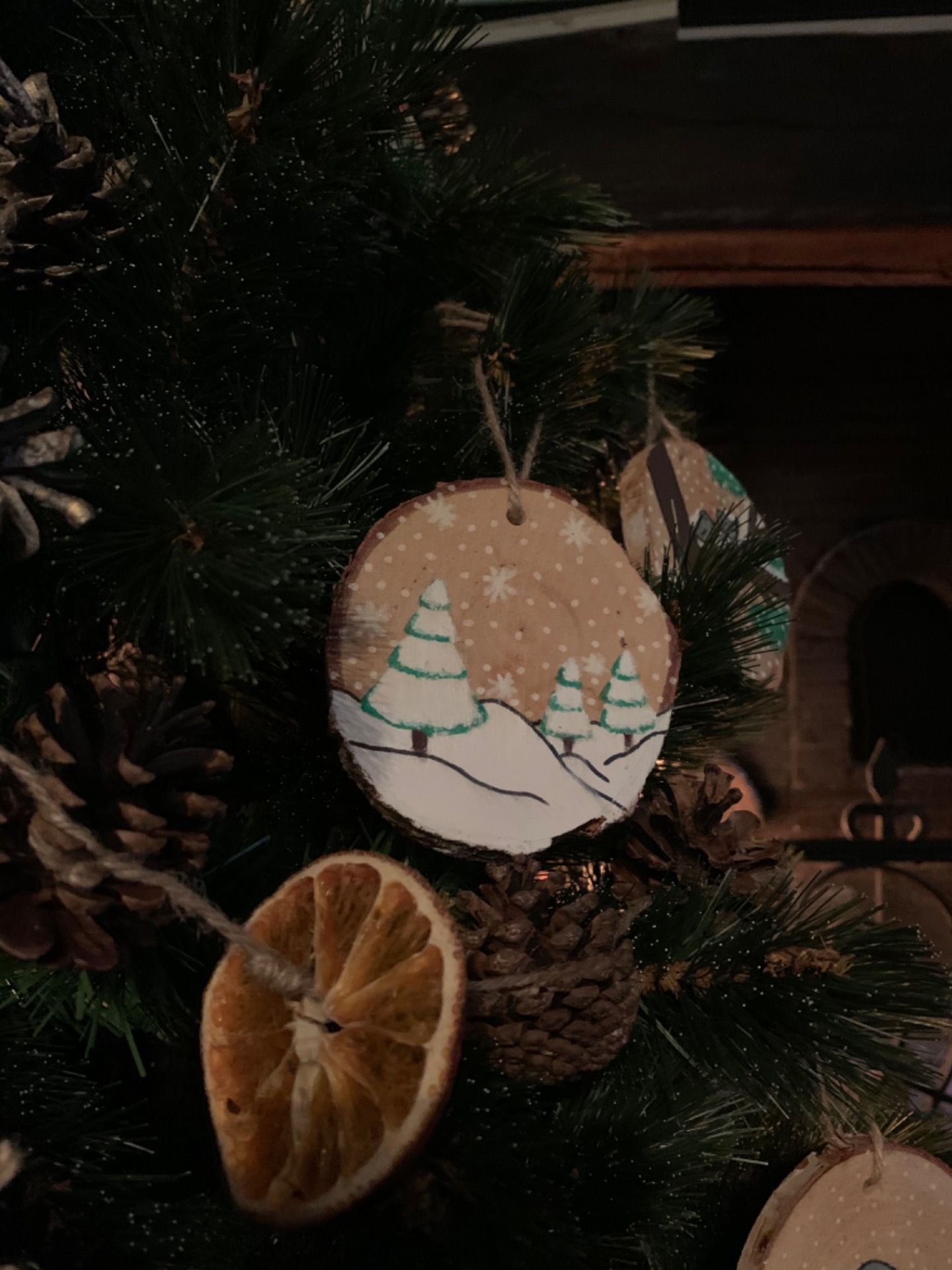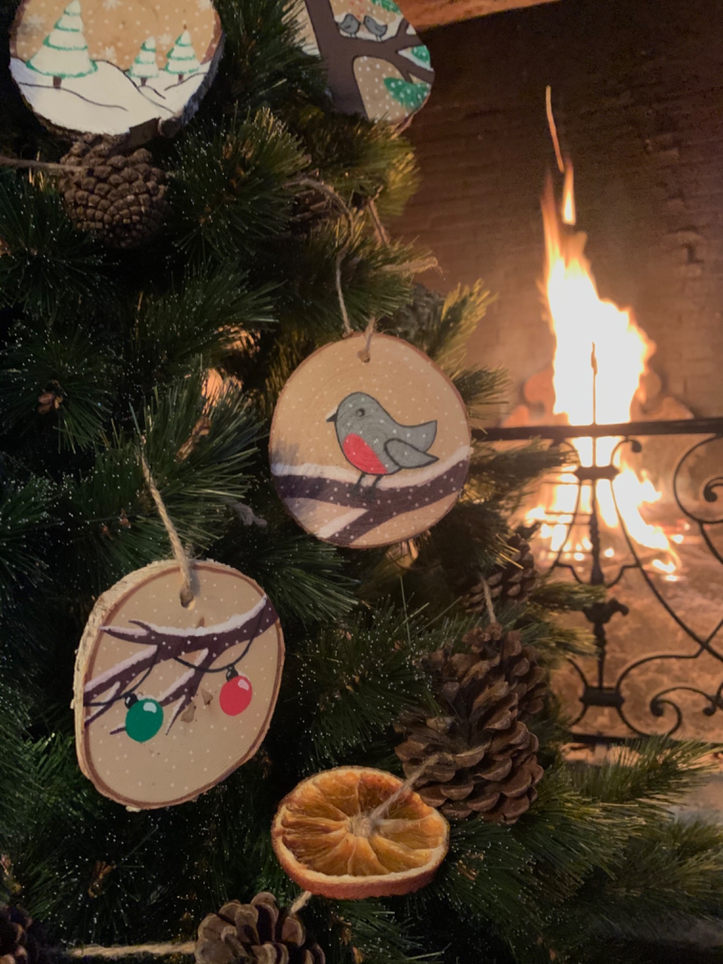 Rondins de bois à suspendre dans le sapin avec différents motifs peints à la main.Pour tout achat (sur la plateforme Etsy) merci de nous indiquer lequel vous désirez.