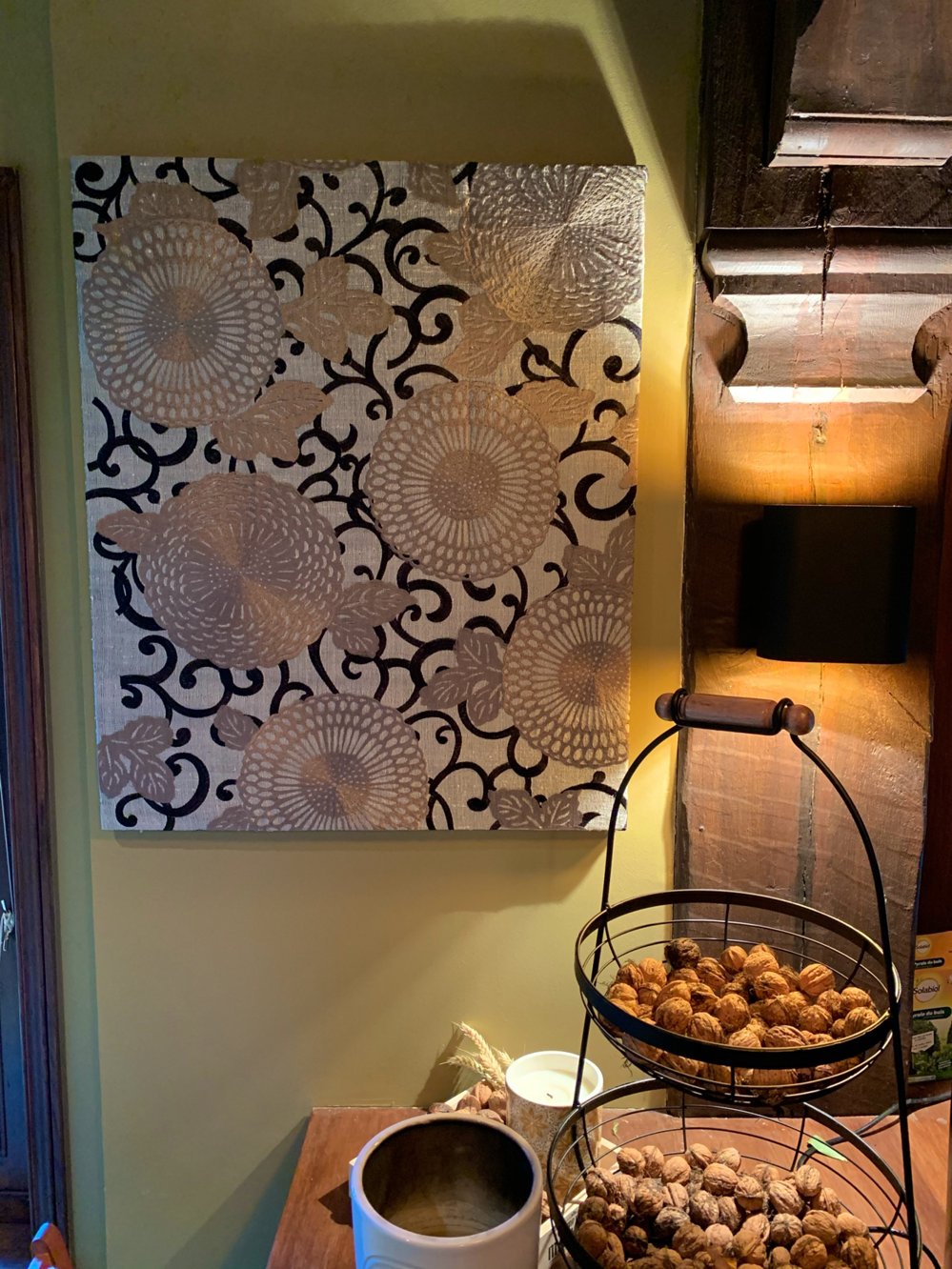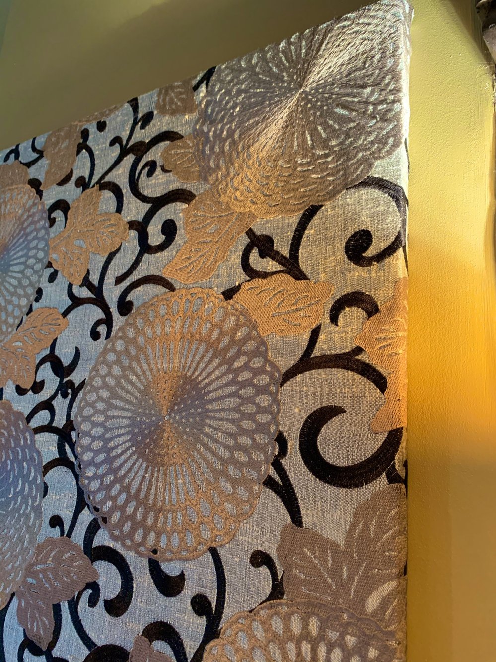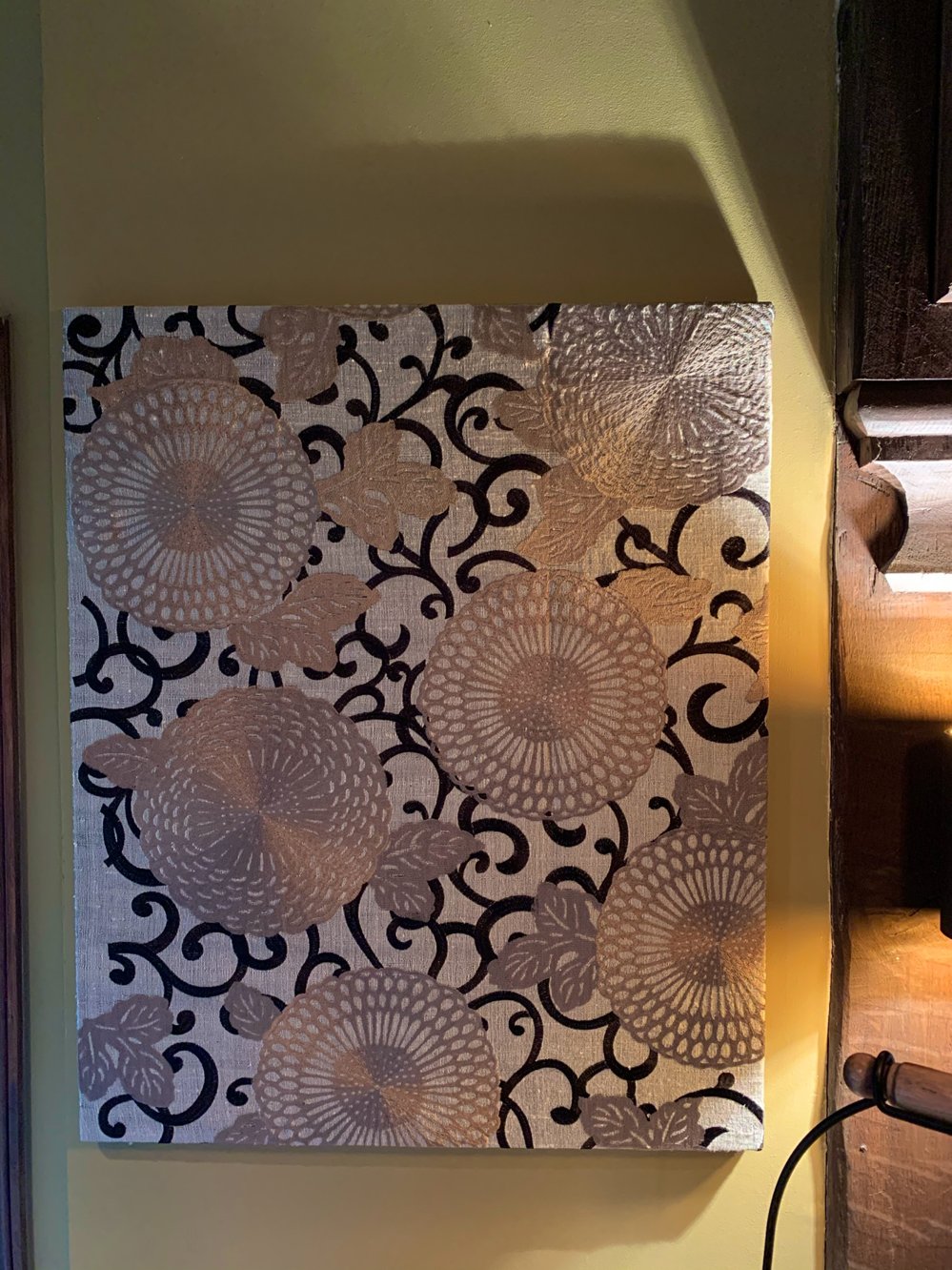Tissu tendu sur un châssis en bois, le tissu provient du fabriquant de tissu d'ameublement Pierre Frey, c'est une broderie, les principales couleurs sont le gris, le noir et le taupe.