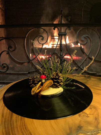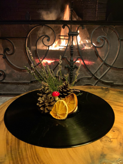 Vinyl 33 rpm fall to color your interior while waiting for Christmas. It is composed of pine cones, dried oranges, heather and a small mushroom.